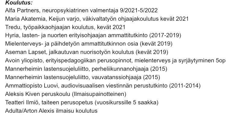 Koulutukseni on neuropsykiatrinen valmentaja, lasten- ja nuorten erityisohjaaja sekä audiovisuaalisen viestinnän assistentti. Olen suorittanut myös MLL:n perheliikunnan ja vauvatanssiohjaajan koulutukset ja suunnitellut ja ohjannut kursseja. Olen käynyt jalkautuvan nuorisotyön koulutuksen sekä omaan EA1 ja EA2 kortit, ikärajapassin ja hygieniapassin.