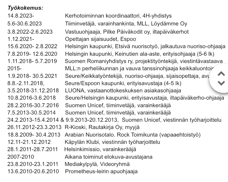 Näiden lisäksi olen tehnyt keikkaa nuoriso-ohjaajana, opettajana, avustajana sekä asiakasohjaajana vastaanottokeskuksissa (kohteena perheet, lapset ja nuoret aikuiset).